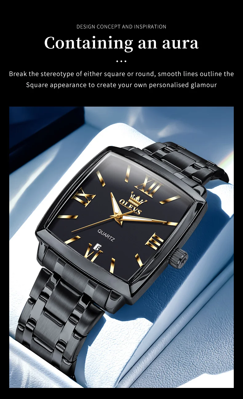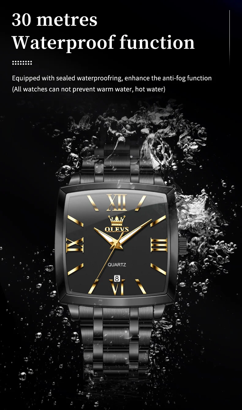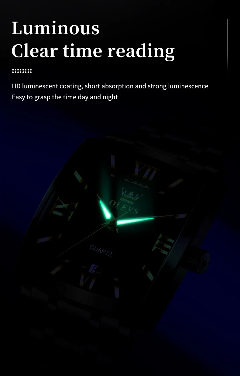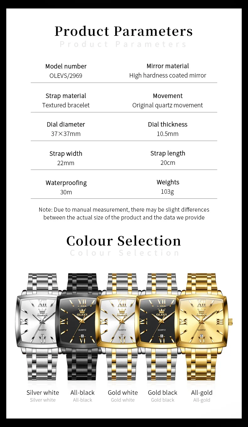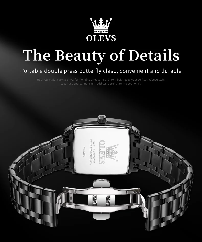 Model : OLEVS 2969 Dial Window Material Type: Coated Glass Clasp Type: Folding Clasp with Safety Case Thickness: 10.5mm Strap Width: 22mm Case Shape: Square Water Resistance Depth: 3Bar