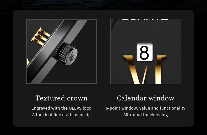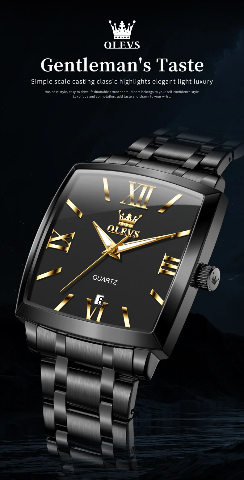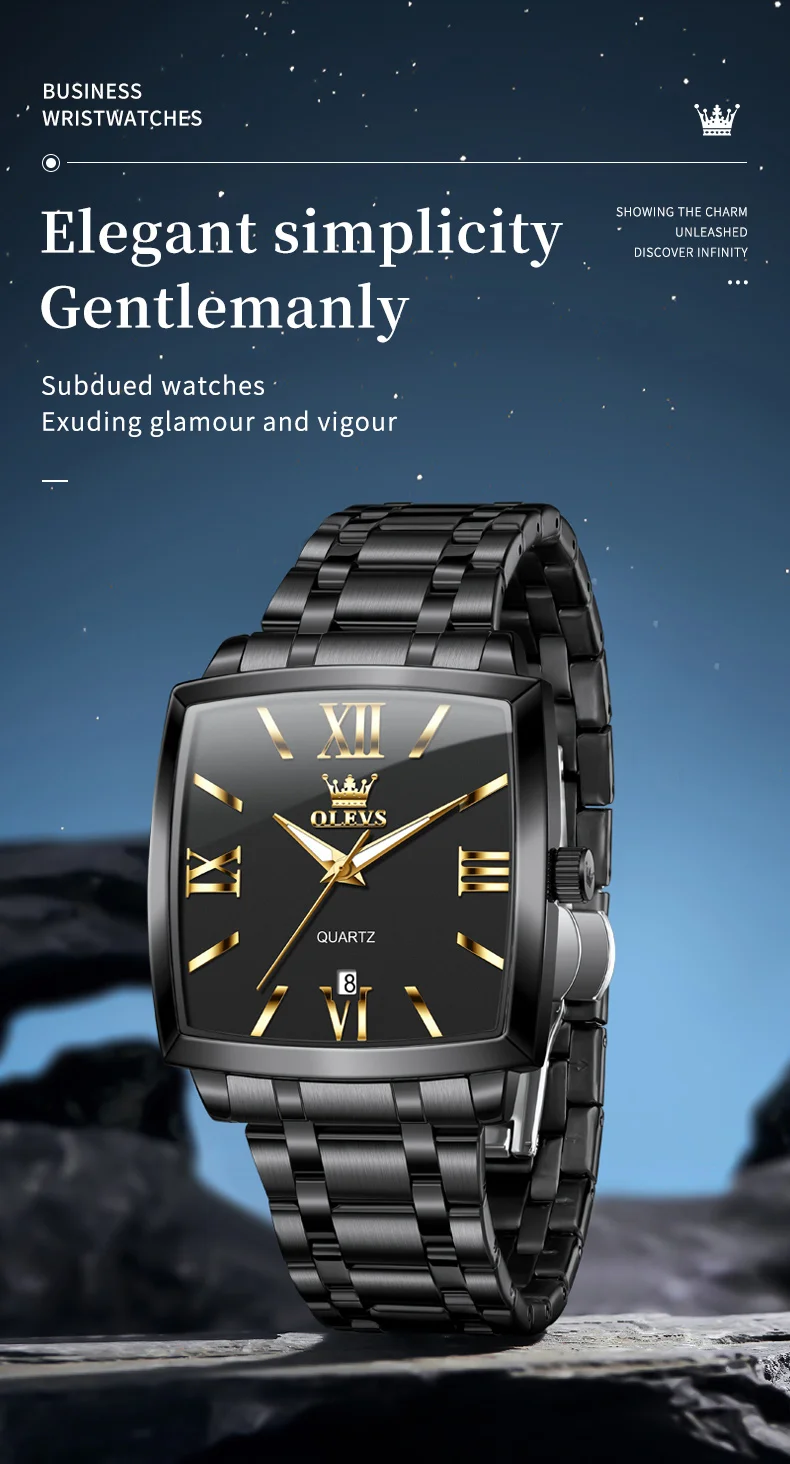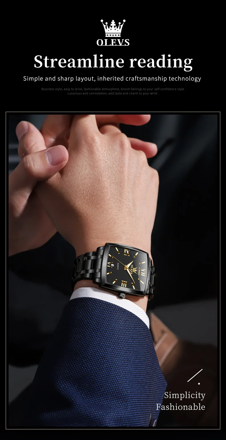 Model : OLEVS 2969 Dial Window Material Type: Coated Glass Clasp Type: Folding Clasp with Safety Case Thickness: 10.5mm Strap Width: 22mm Case Shape: Square Water Resistance Depth: 3Bar